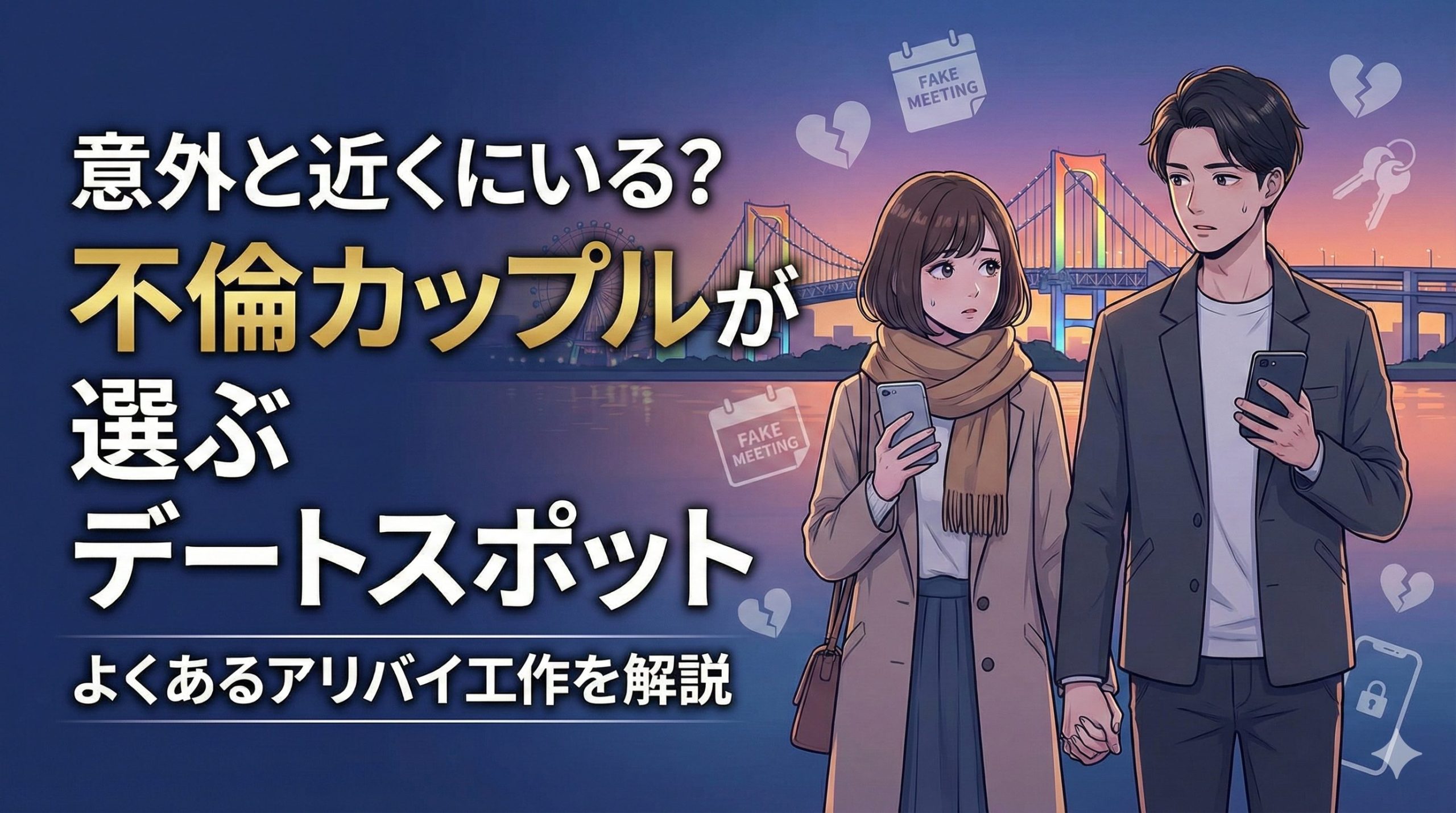 灯台下暗しとはよく言ったもので、毎日の買い物に行くスーパーや、通勤途中の駅周辺などが現場になっているケースも珍しくありません。不倫カップルは、目立つことよりも「日常に溶け込むこと」を最優先にするからです。この記事では、そんな彼らが選びがちなデートスポットと、それを隠すためのよくあるアリバイ工作について、私のライターとしての経験を交えてお話しします。