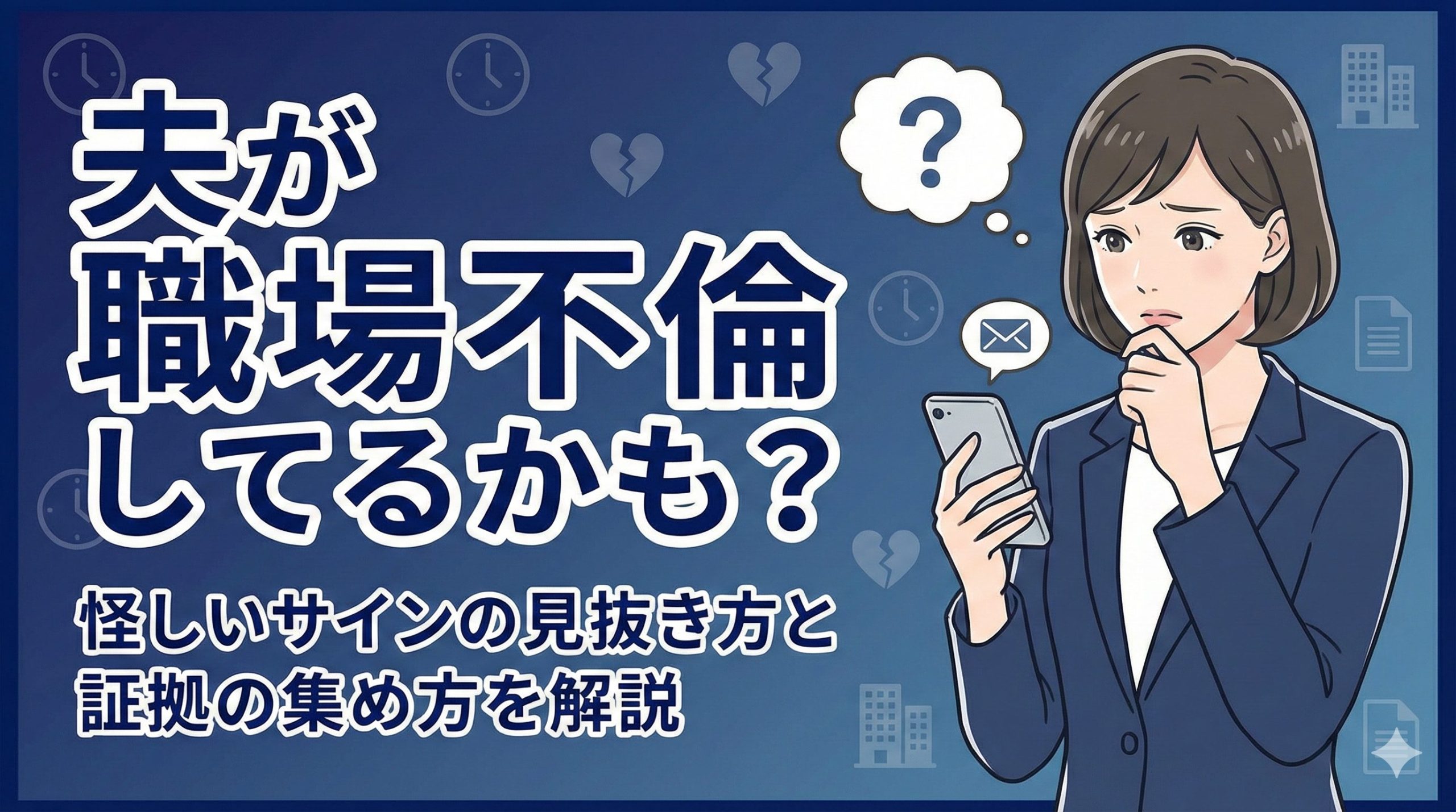 もし夫が職場不倫をしているなら、早めに怪しいサインに気づいて、確実な証拠を集める準備をしておくことが自分を守ることにつながります。この記事では、プロの視点も交えながら、妻だからこそ気づける見抜き方と、賢い証拠の集め方についてお話ししますね。
