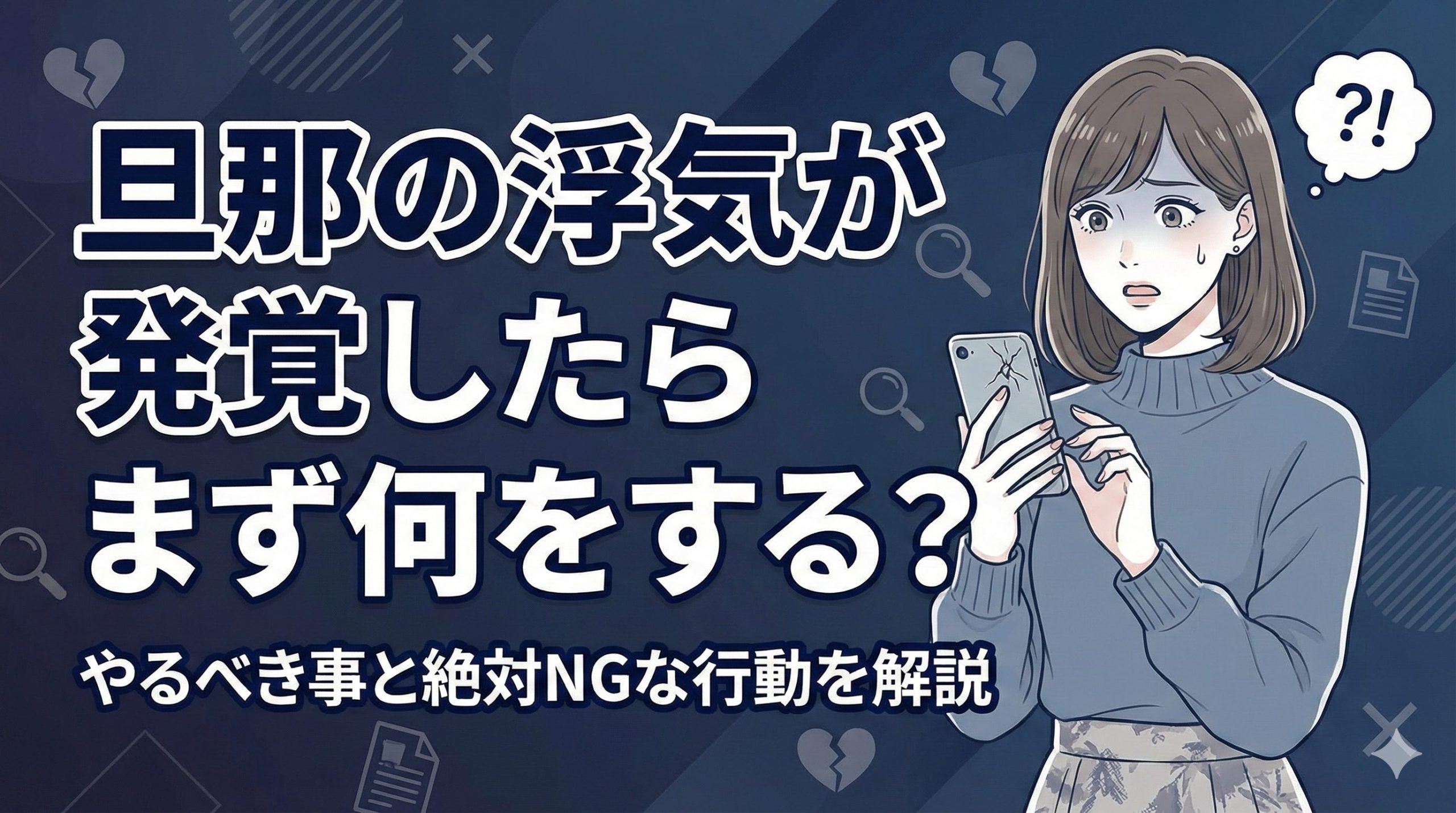 「まさかうちの人が」と、信じていた旦那の浮気が発覚したら、頭が真っ白になってパニックになるのは当然です。でも、ここで感情のままに行動してしまうと、あなた自身が不利な立場に追い込まれてしまうかもしれません。まずは深呼吸をして、旦那の浮気が発覚したらやるべき事と、絶対にやってはいけないNGな行動を整理していきましょう。
