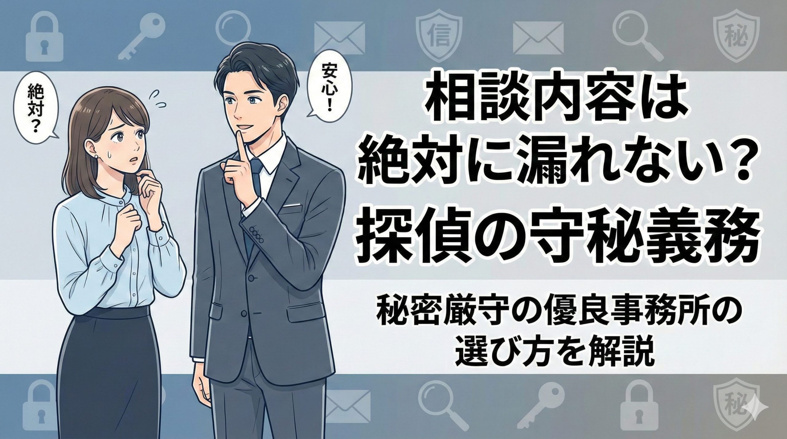探偵社には「守秘義務」という法律上のルールがあり、相談内容や依頼者の情報を外部に漏らすことは絶対にありません。